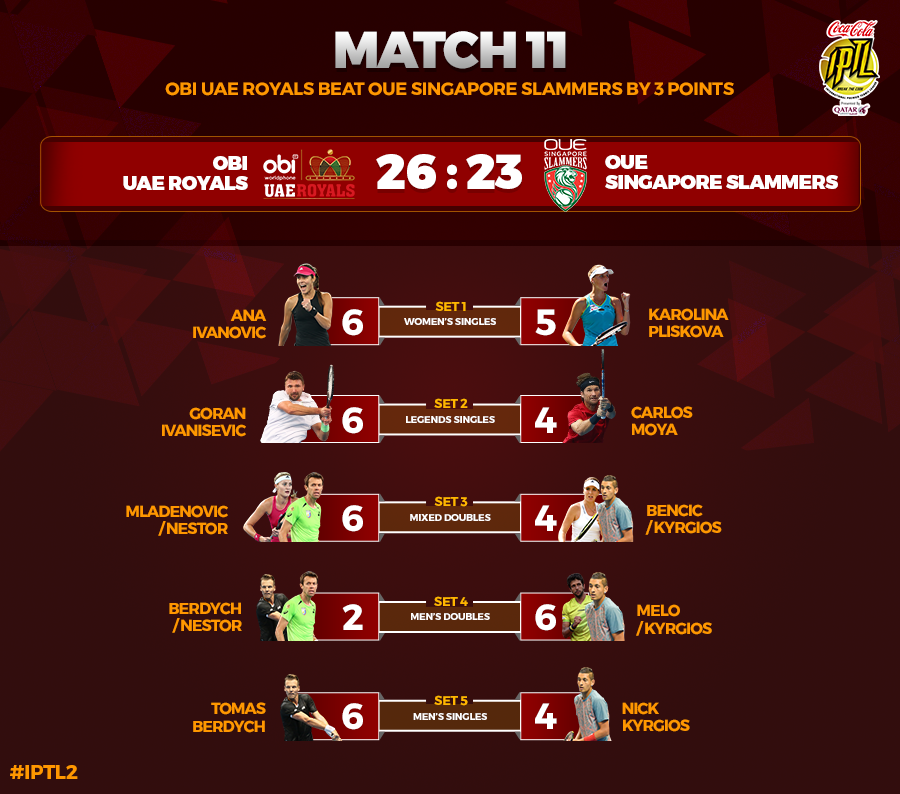 The UAE Royals winning onslaught continued in the mixed doubles. Kristina Mladenovic, who has won two mixed doubles Grand Slam titles, paired up with Daniel Nestor against Nick Krygios and Belinda Bencic. Despite a positive start from the Slammers, who broke Mladenovic and Nestor in the third game. They were unable to hold on to the lead as the Royals levelled the set once again. At 4-4, Mladenovic and Nestor struck once again as they won two consecutive games to take the set 6-4. The winning pair produced 13 winners and 8 unforced errors.