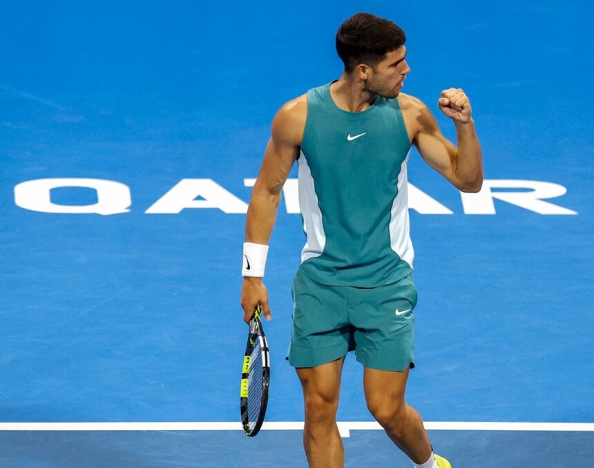 Top seed Carlos Alcaraz recovered from a second-set loss to beat Italian qualifier Luca Nardi 6-1 4-6 6-3 in the second round after 1 hour and 52 minutes at the Qatar Exxon Mobil Open in Doha. Alcaraz has extended his winning streak to twelve consecutive matches at the ATP 500 matches.